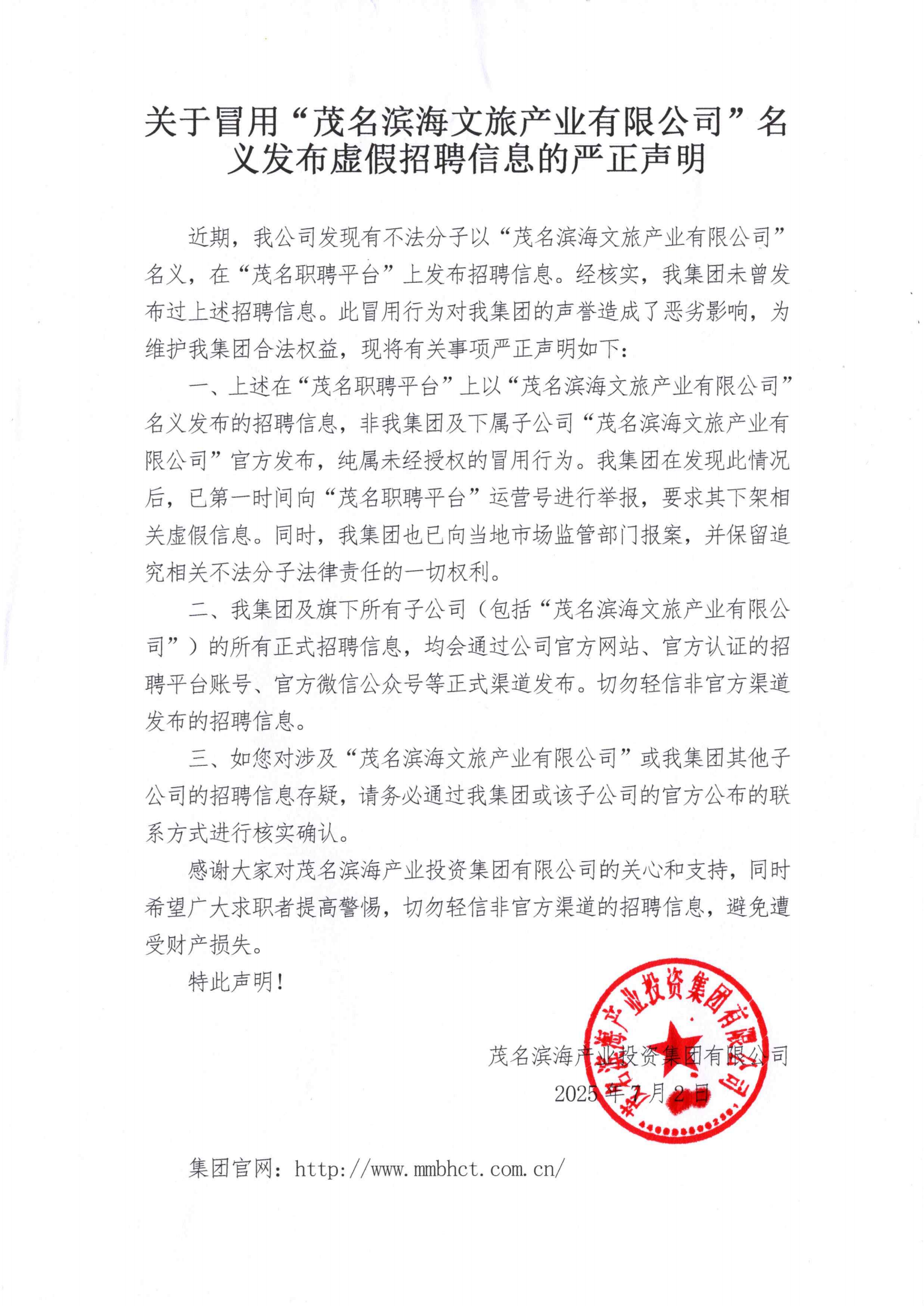 关于冒用“茂名滨海文旅产业有限公司”名义发布虚假招聘信息的严正声明